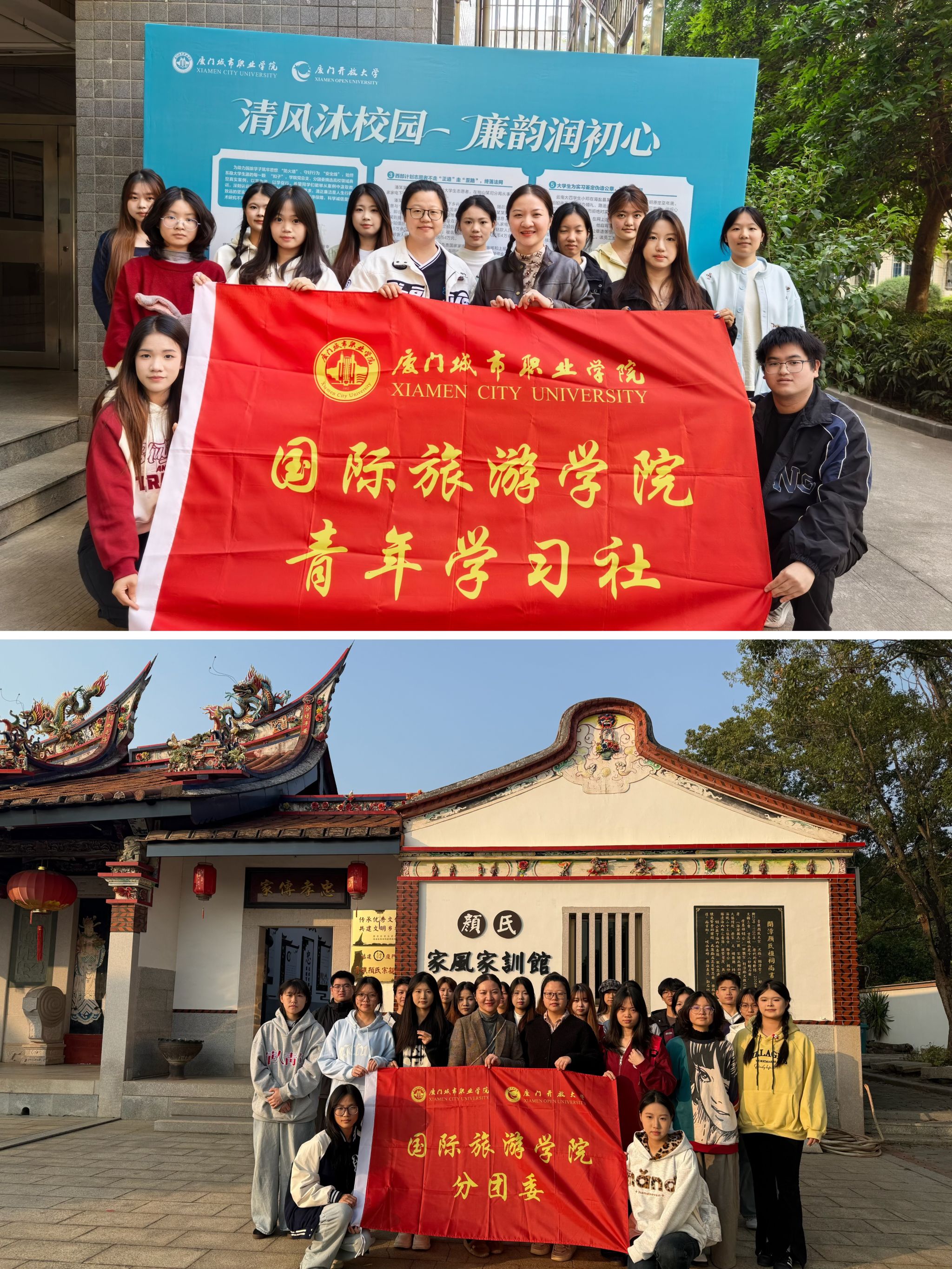 理论学习筑牢思想根基,实地研学深化实践认知。在理论学习之外,学院分团委还组织学生干部赴海沧青礁村颜氏家风家训馆参观学习。在讲解员的引导下,师生们逐一参观了“公生明廉生威”三十六字官箴墙、历代名人廉洁故事雕刻和颜氏历代先贤廉洁事迹展陈,深刻感受颜师鲁、颜颐仲等历史人物“清慎自持”的为官之道,以及颜氏家族“孝悌忠信、礼义廉耻”的治家理念和“忠孝传家、诗书继世”的家国情怀。在现场互动交流中,学生干部们结合自身岗位职责,探讨如何将颜氏家风家训中的廉洁元素融入日常工作,更好地把纪律、规矩内化于心、外化于行。